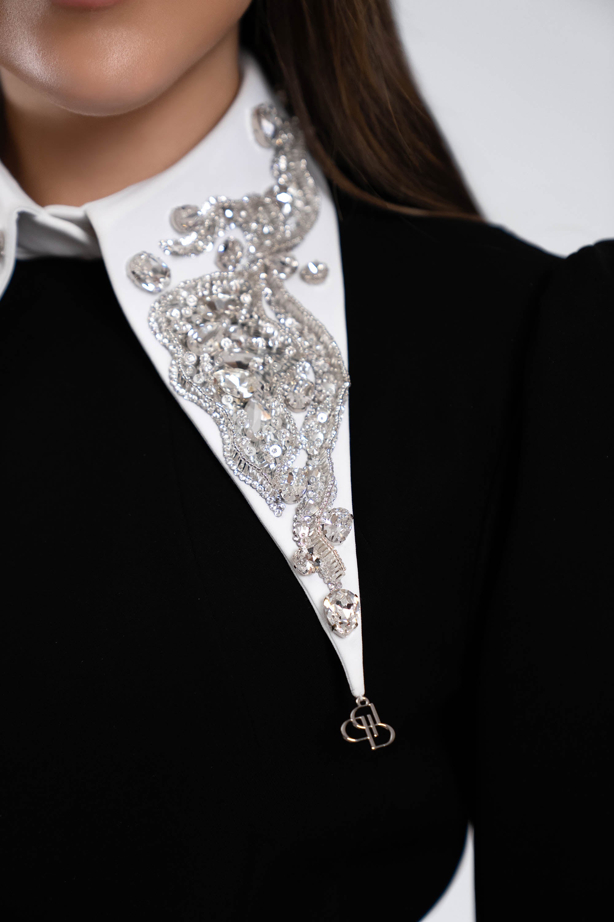 - The handcrafted artistic and creative work in this Collar includes: 1,534+ crystals, 400+ silver color sequins, 2,900+ beads and metallic silver color thread. Each one was meticulously hand-placed to bring captivating brilliance to the design.