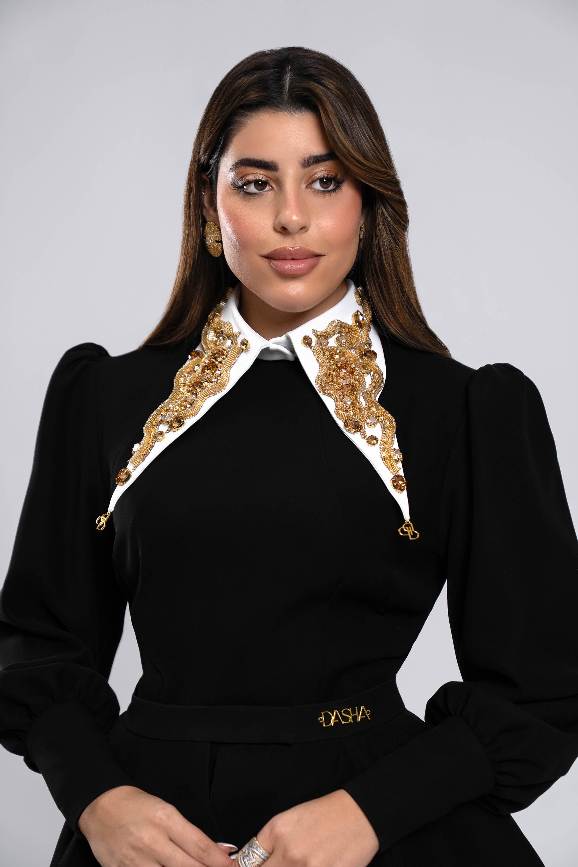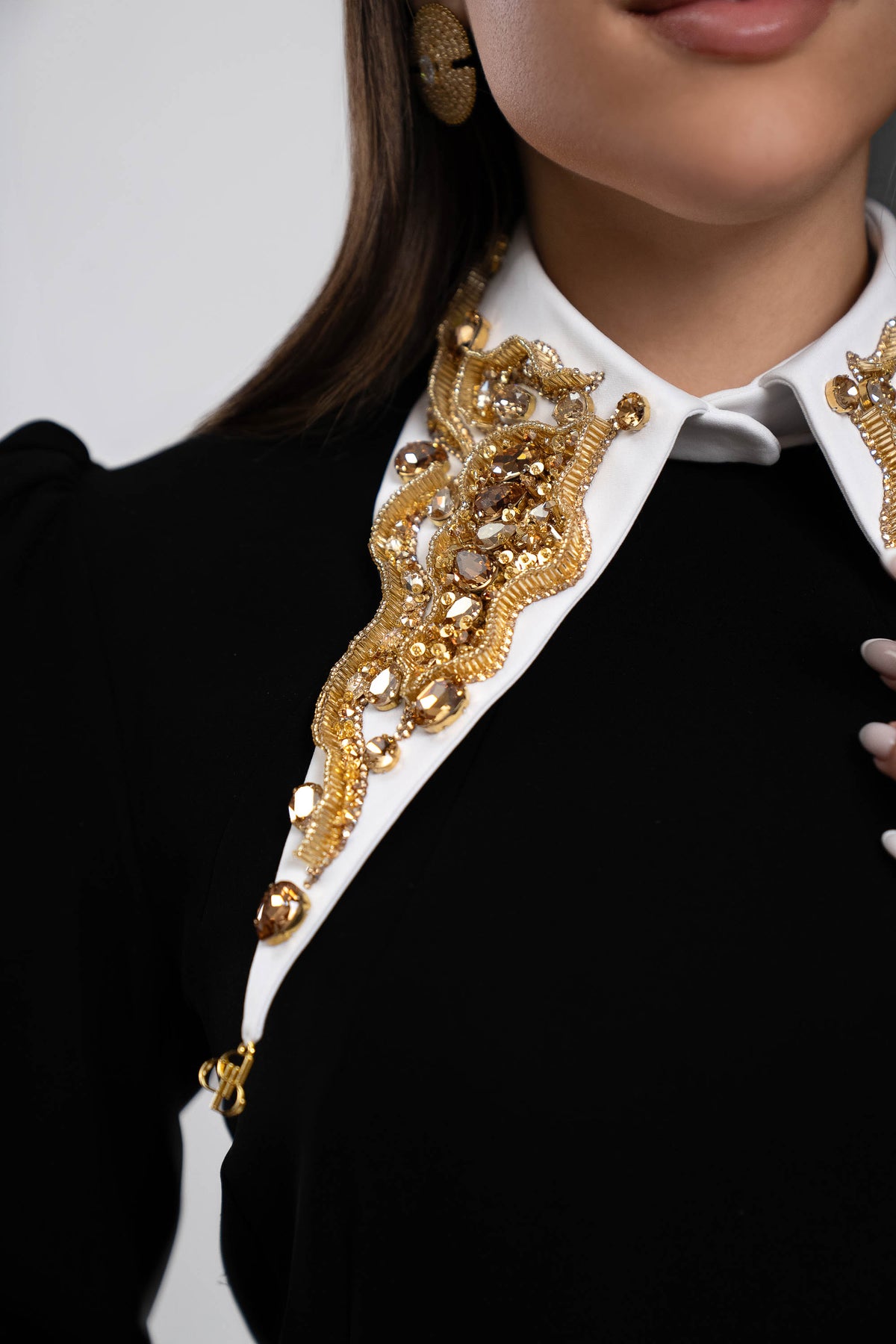 Inspired by the gentle warmth of the sun, this handcrafted collar is made on a crepe base and adorned with golden color embroidery including more than 1,534 crystals. Designed to be attachable and detachable, it gives you the freedom to style your look with effortless elegance.
