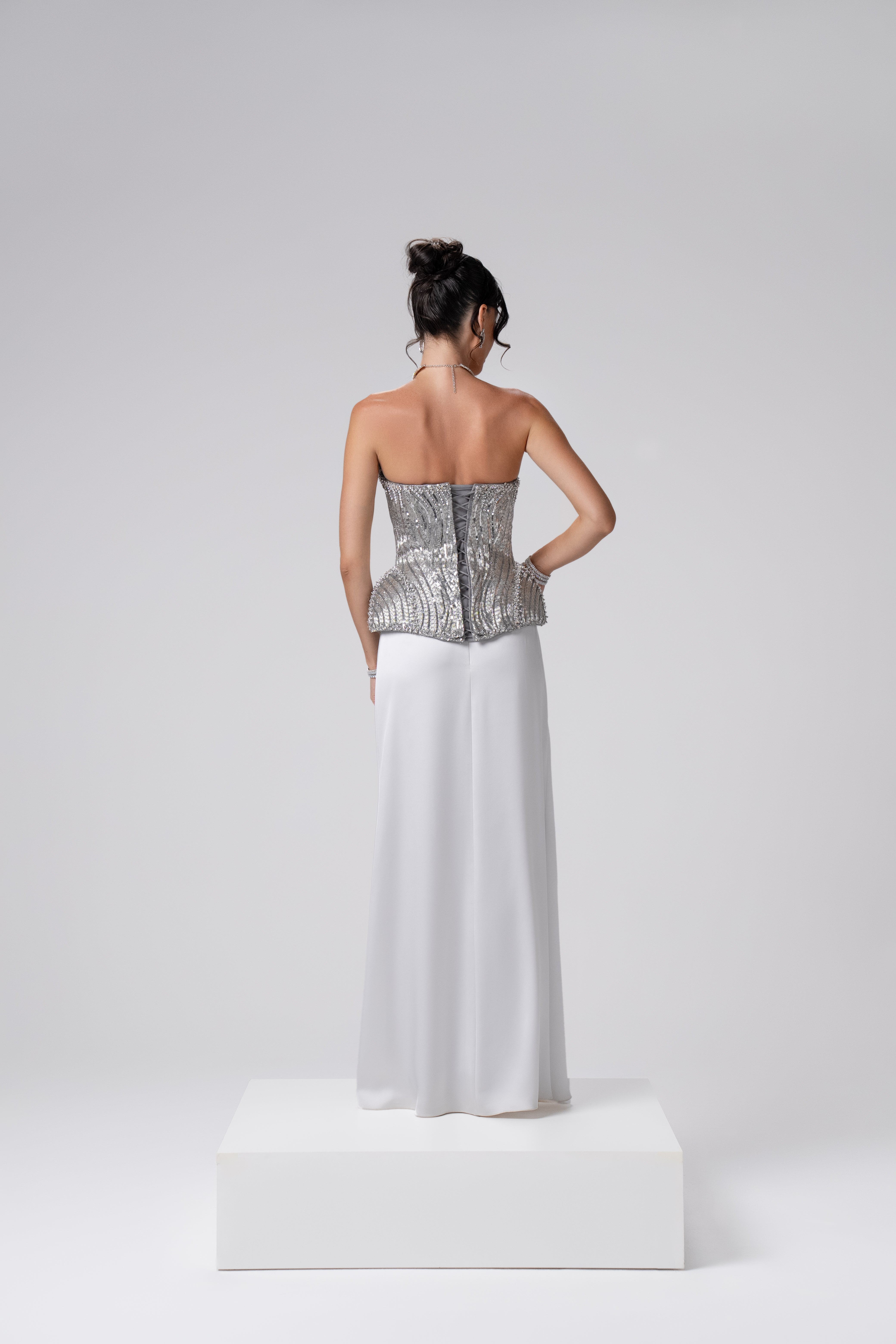This corset radiates celebrity glamour with its shimmering silver design and intricate beading. Its sculpted structure ensures an unforgettable entrance, perfect for a show-stopping red carpet moment.