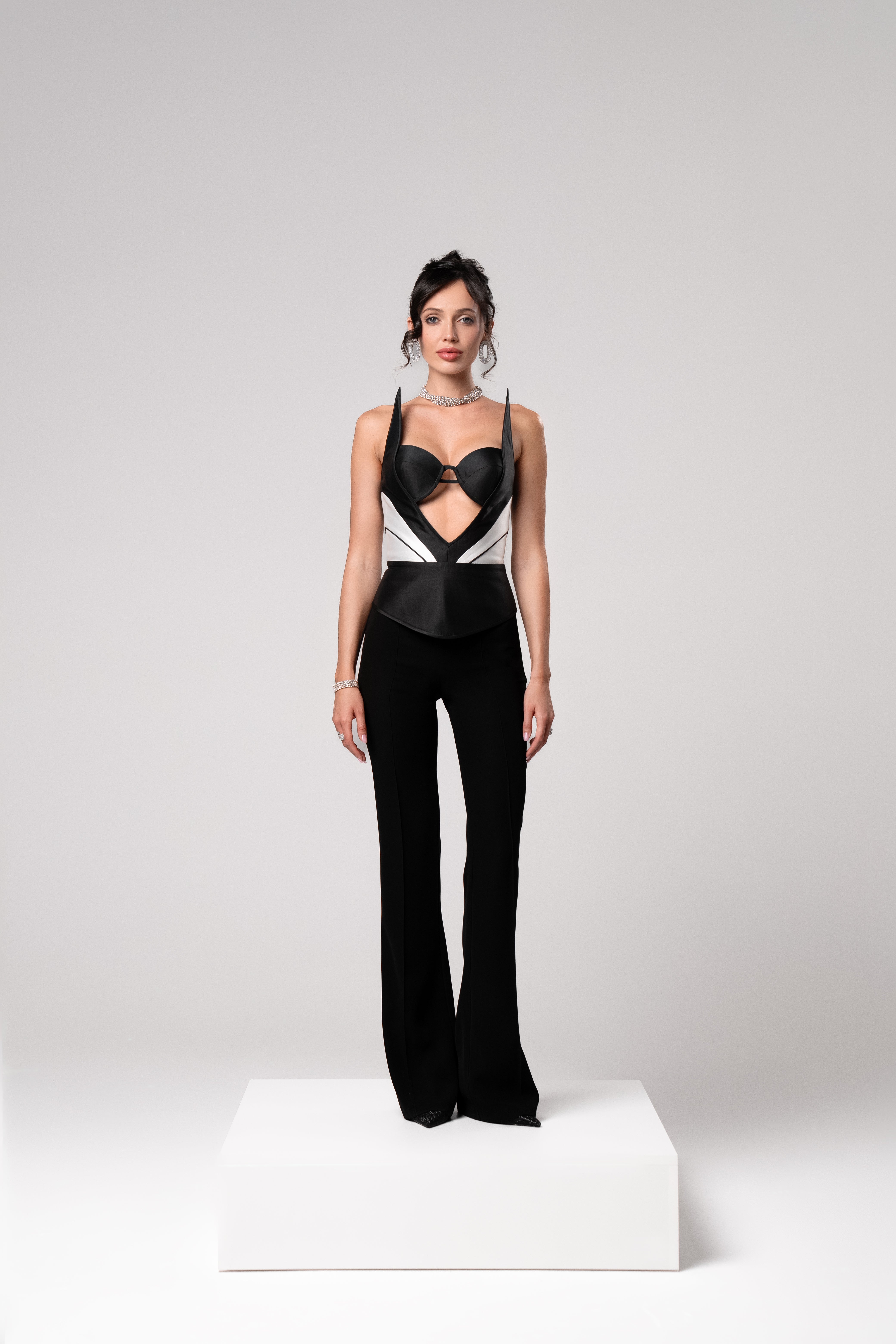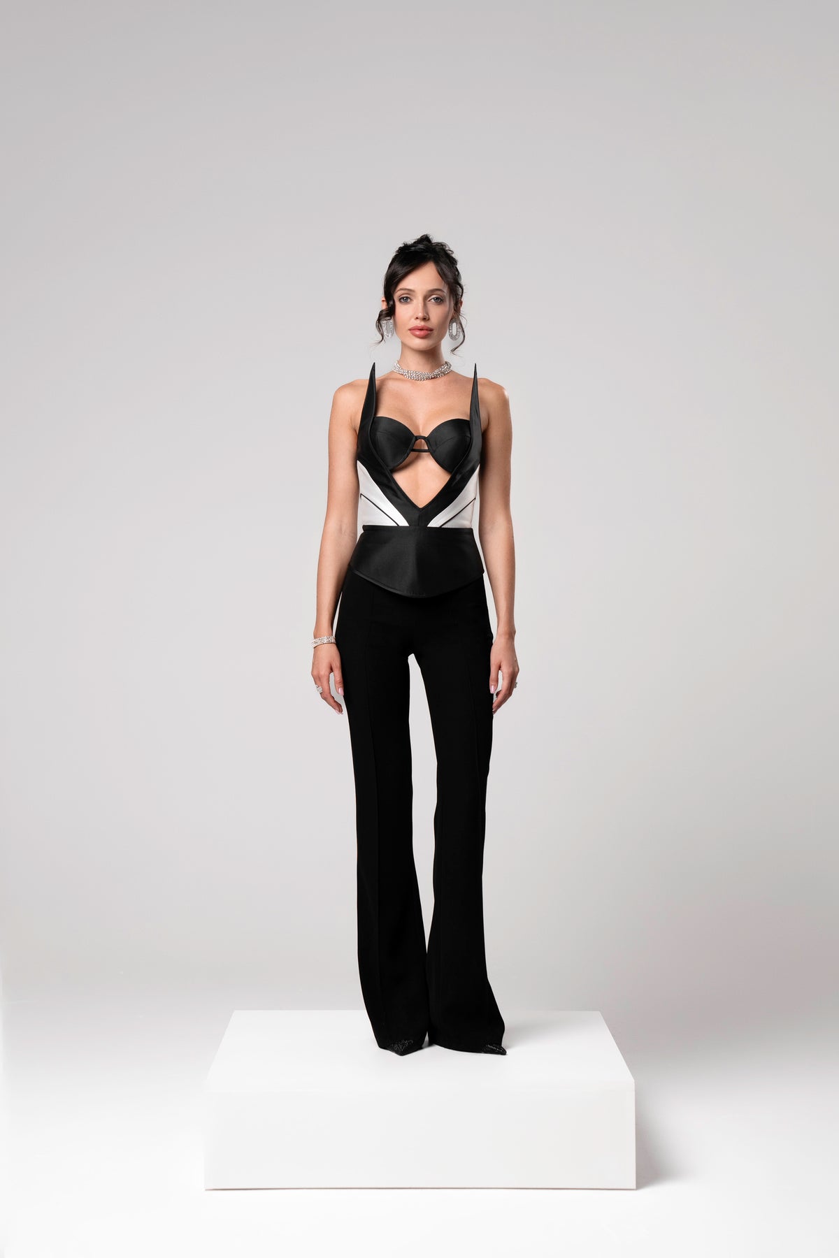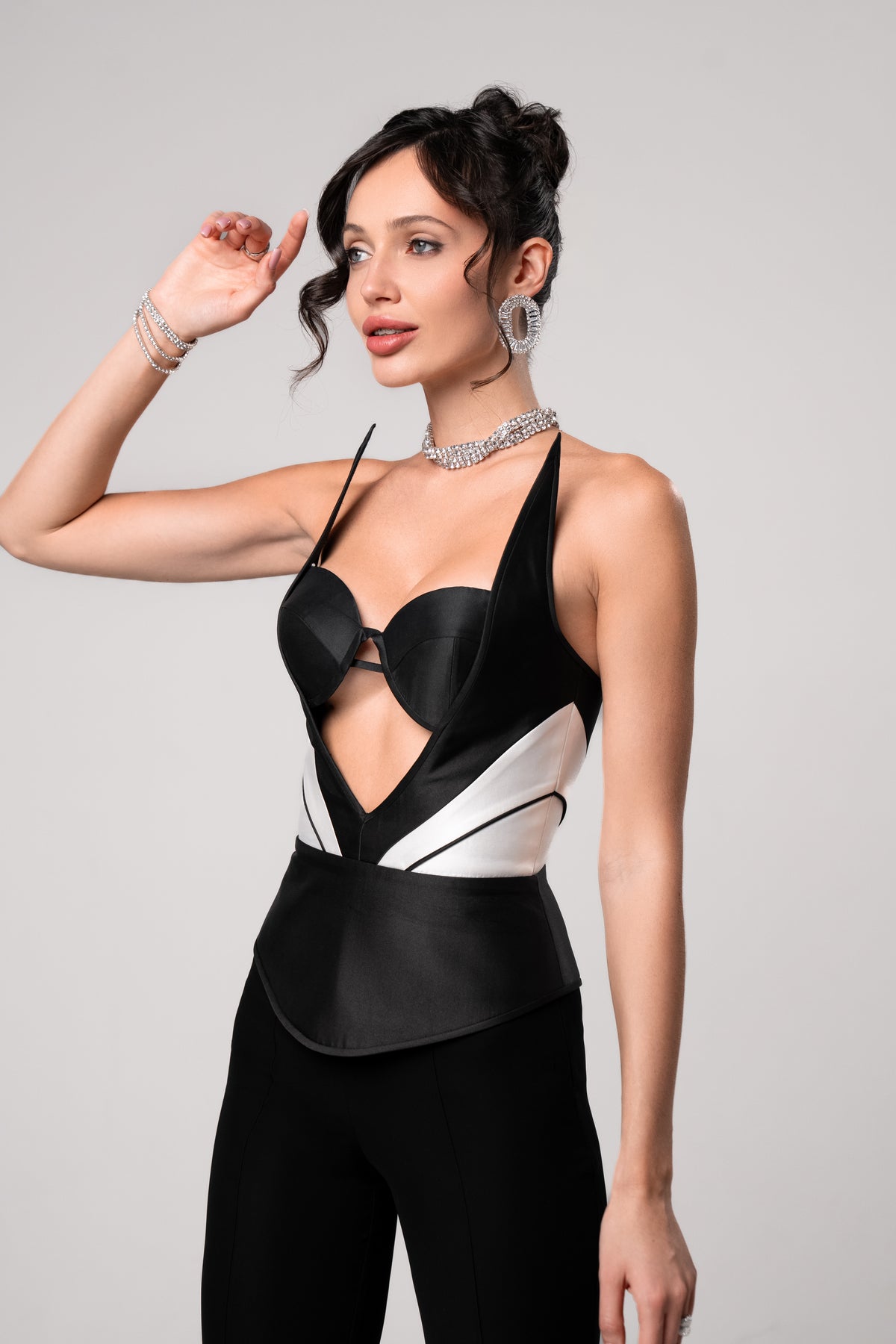 This sleek, structured corset blends bold black and white contrasts, creating a silhouette that’s sharp yet refined. With its angular cutouts and powerful lines, it exudes confidence and a mysterious allure, perfect for a woman who commands attention effortlessly.