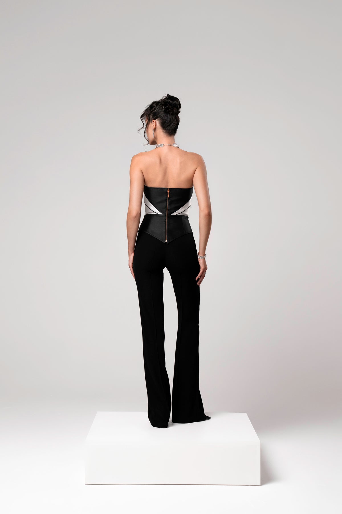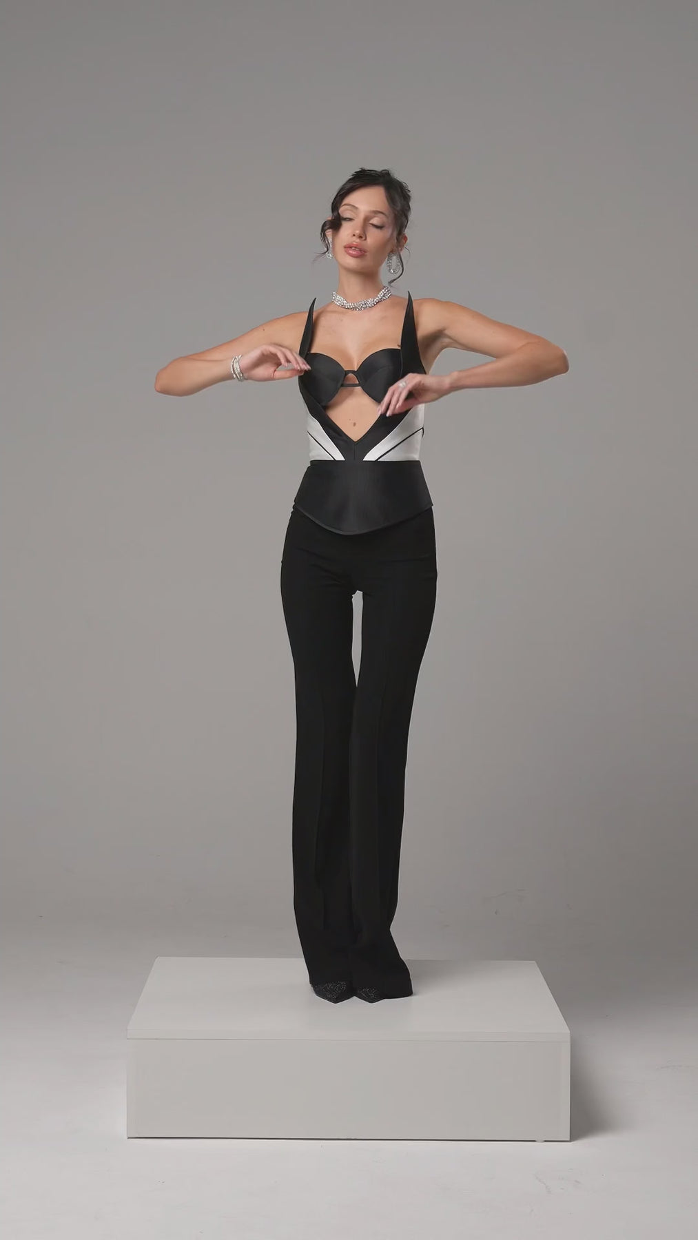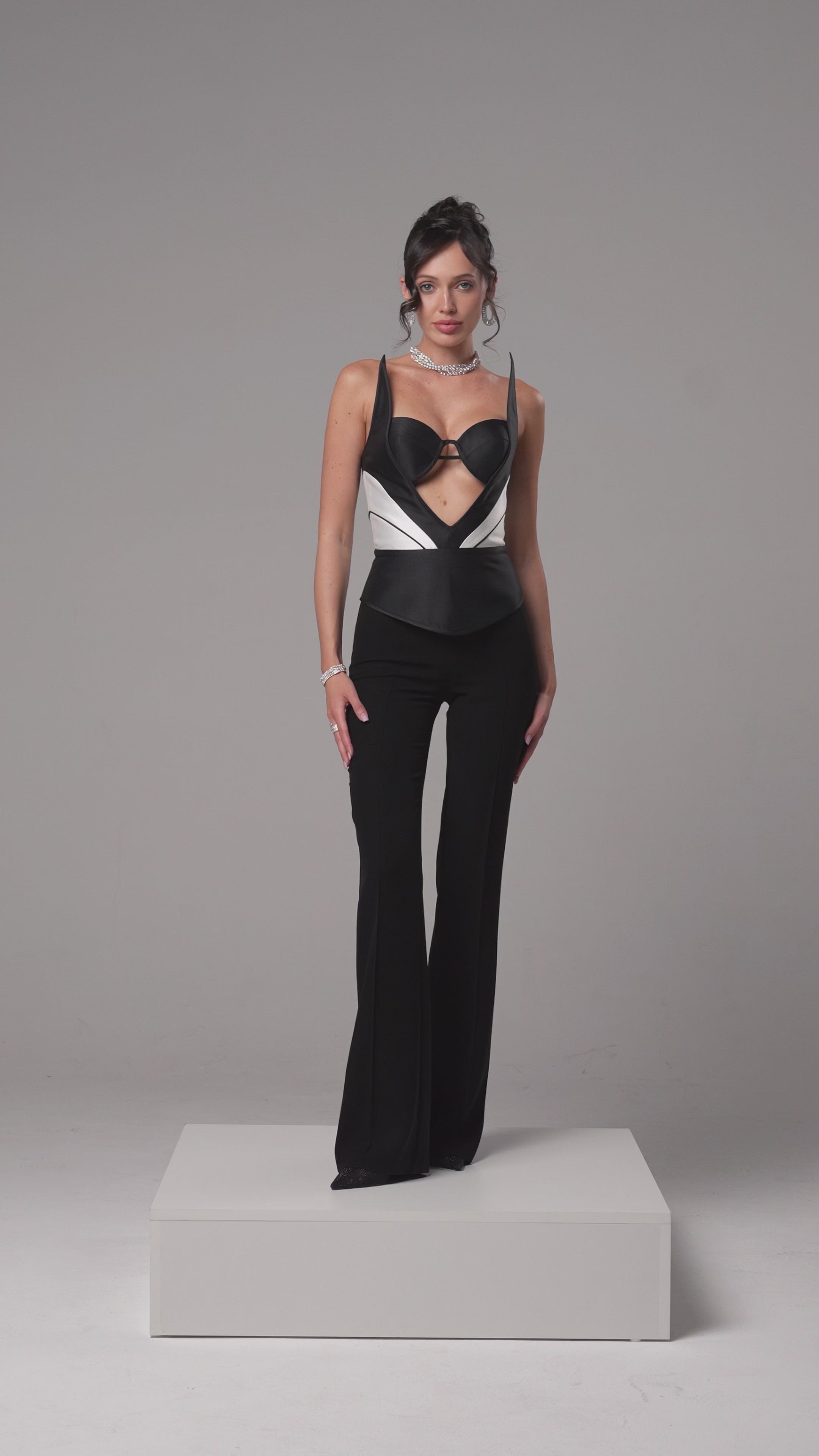 This sleek, structured corset blends bold black and white contrasts, creating a silhouette that’s sharp yet refined. With its angular cutouts and powerful lines, it exudes confidence and a mysterious allure, perfect for a woman who commands attention effortlessly.