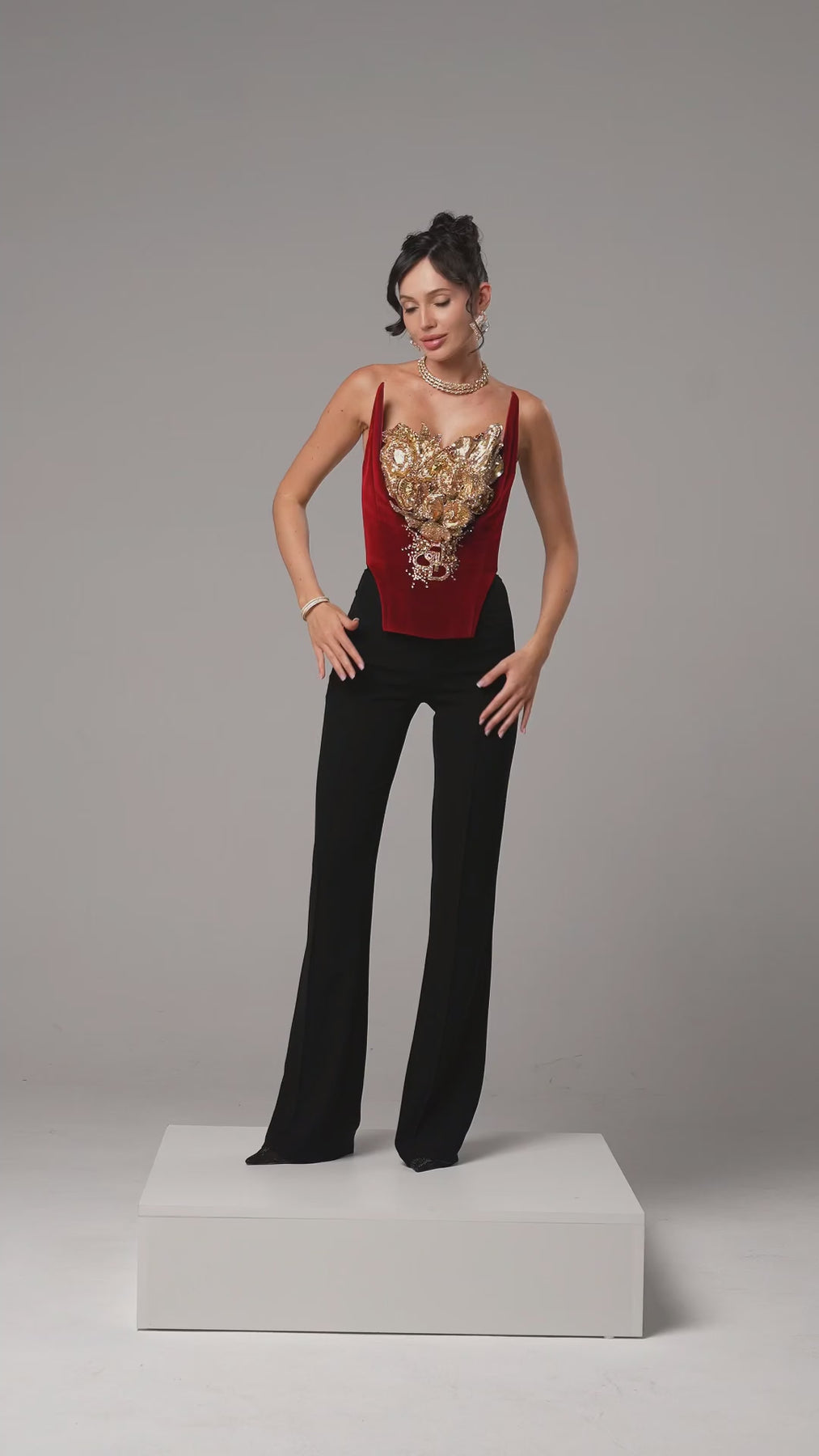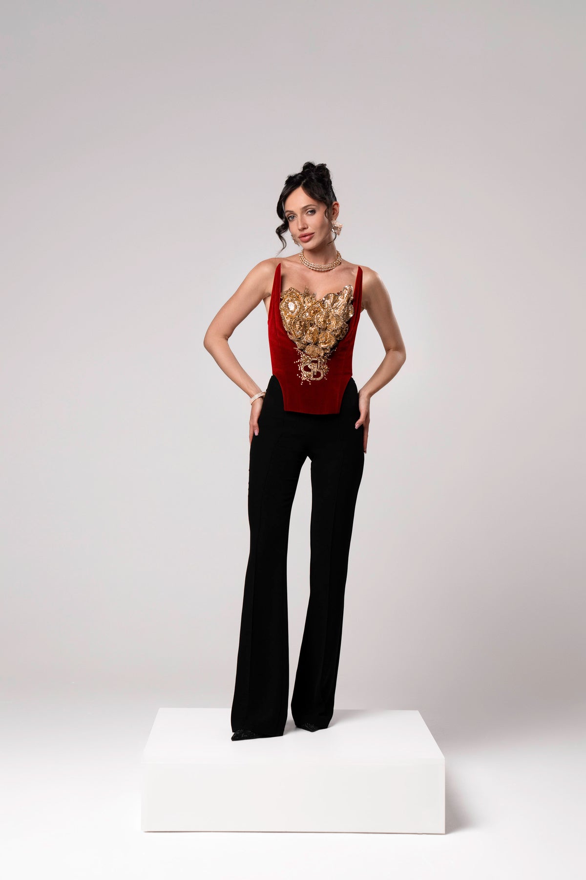 A corset tailored for the woman who reigns with quiet power. Crafted from rich red velvet and golden color embroidery  that blooms across the chest like a royal emblem. Its sculpted neckline and defined bodice shape the silhouette with bold grace. Elianne is a tribute to the woman who doesn’t need to speak to be seen — radiant, elegant, and born to shine.