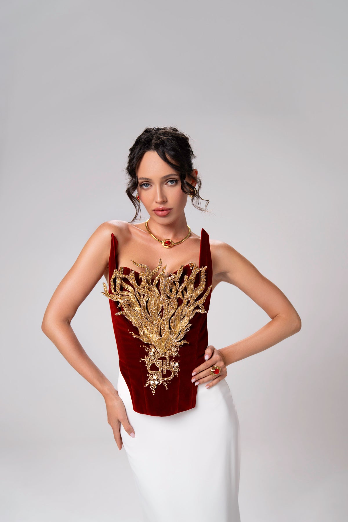 This striking red velvet corset features exquisite gold flame embroidery, creating a fiery, regal look. The bold design fuses luxury with intensity, perfect for the empowered, elegant woman.
