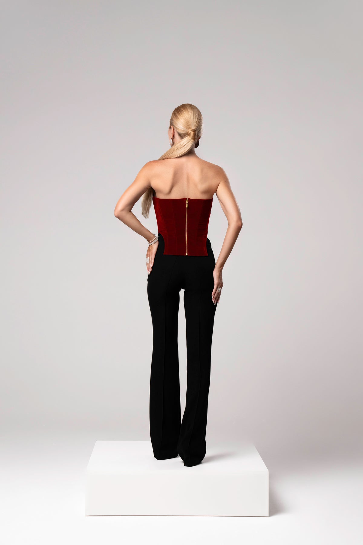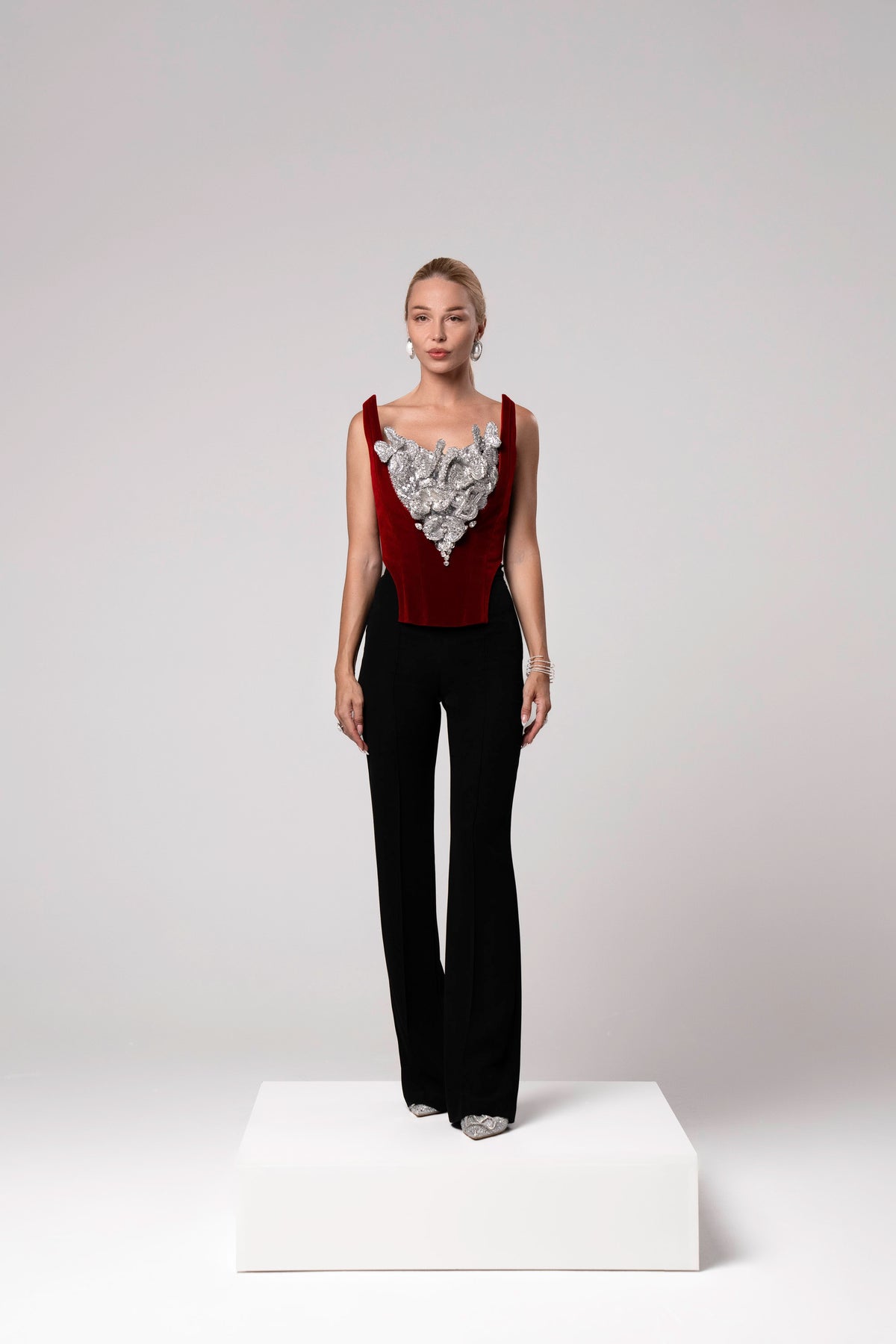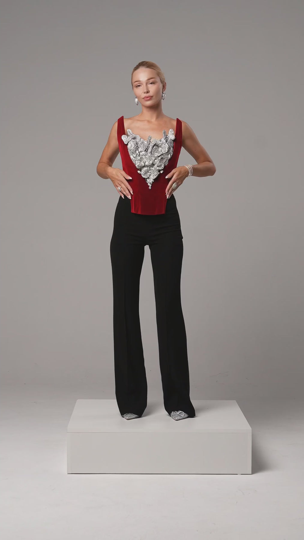 This corset blends rich passion with refined elegance. Crafted in deep red velvet and adorned with silver floral embroidery, the design blooms like moonlight on a rose. The sculpted fit and raised neckline highlight the strength and beauty of the feminine form. LIANA is made for the woman who dares to shine with quiet confidence — graceful, bold, and unforgettable.