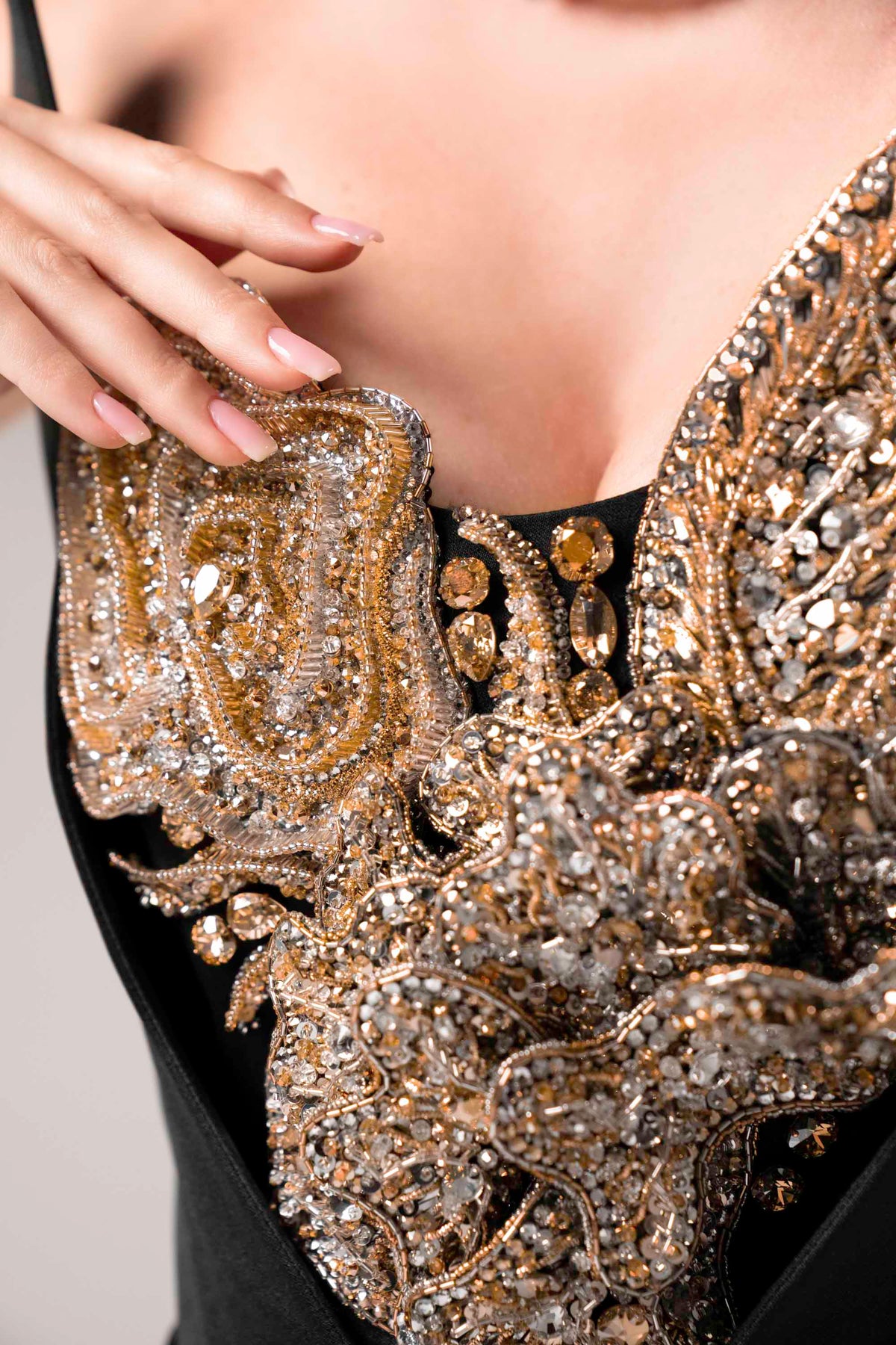 • Professional Care: Due to the detailed craftsmanship and delicate fabrics, crystals, metallic beads and metallic thread, it is advised to seek professional couture garment care service.