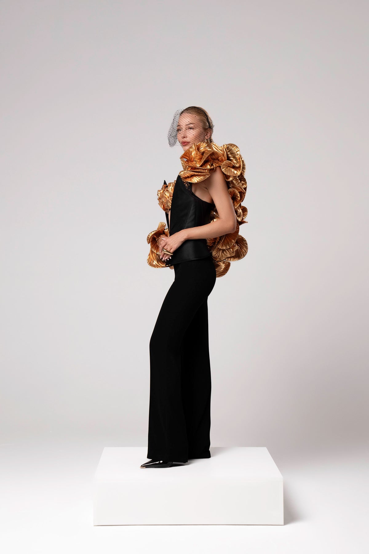 This luxurious corset features cascading golden shell-like ruffles that evoke elegance and sophistication. The bold design is perfect for those who embrace opulence and refined beauty.